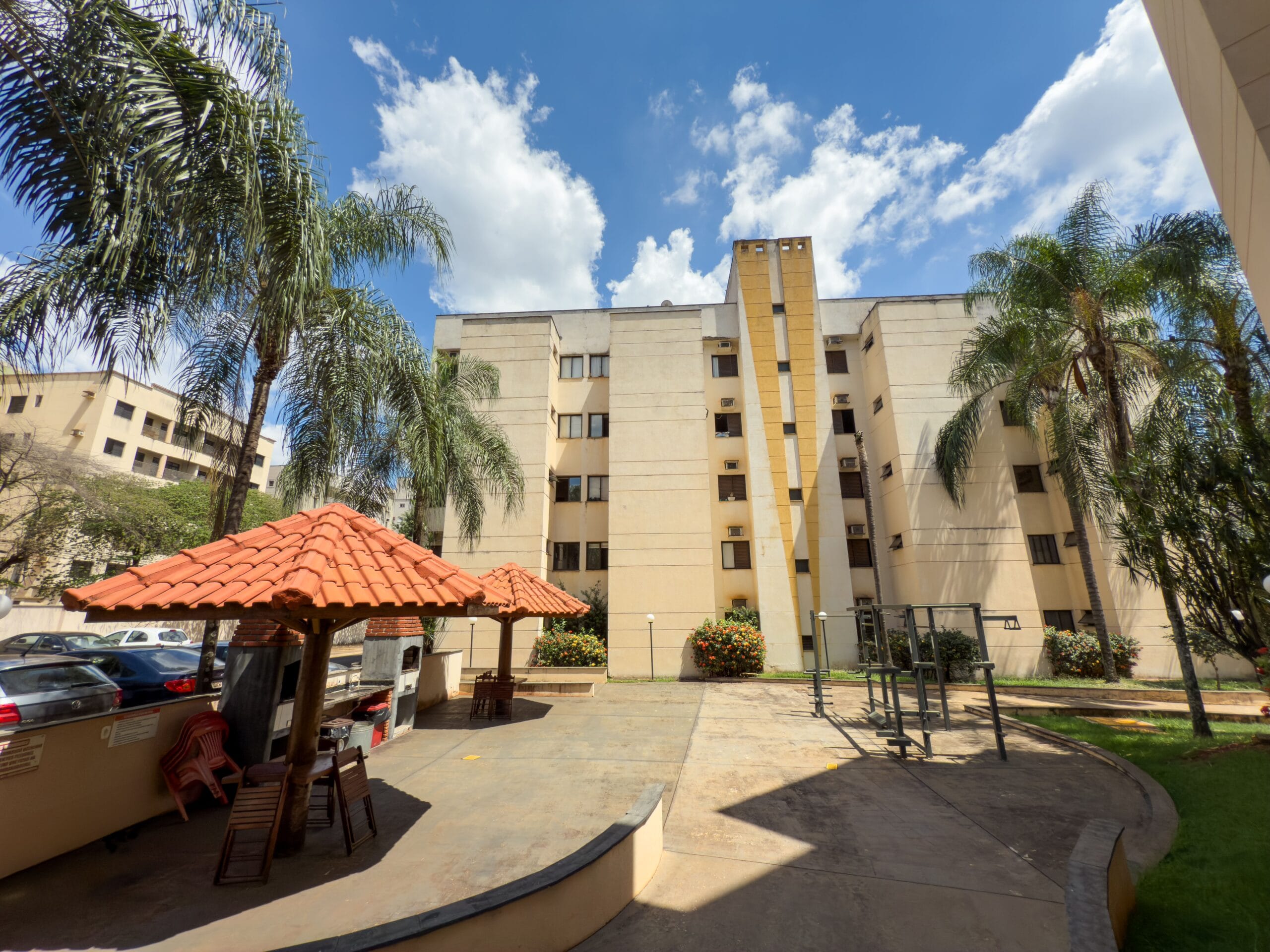 Condomínio equipado com piscinas, academia, salão de festas e churrasqueira para lazer e entretenimento.